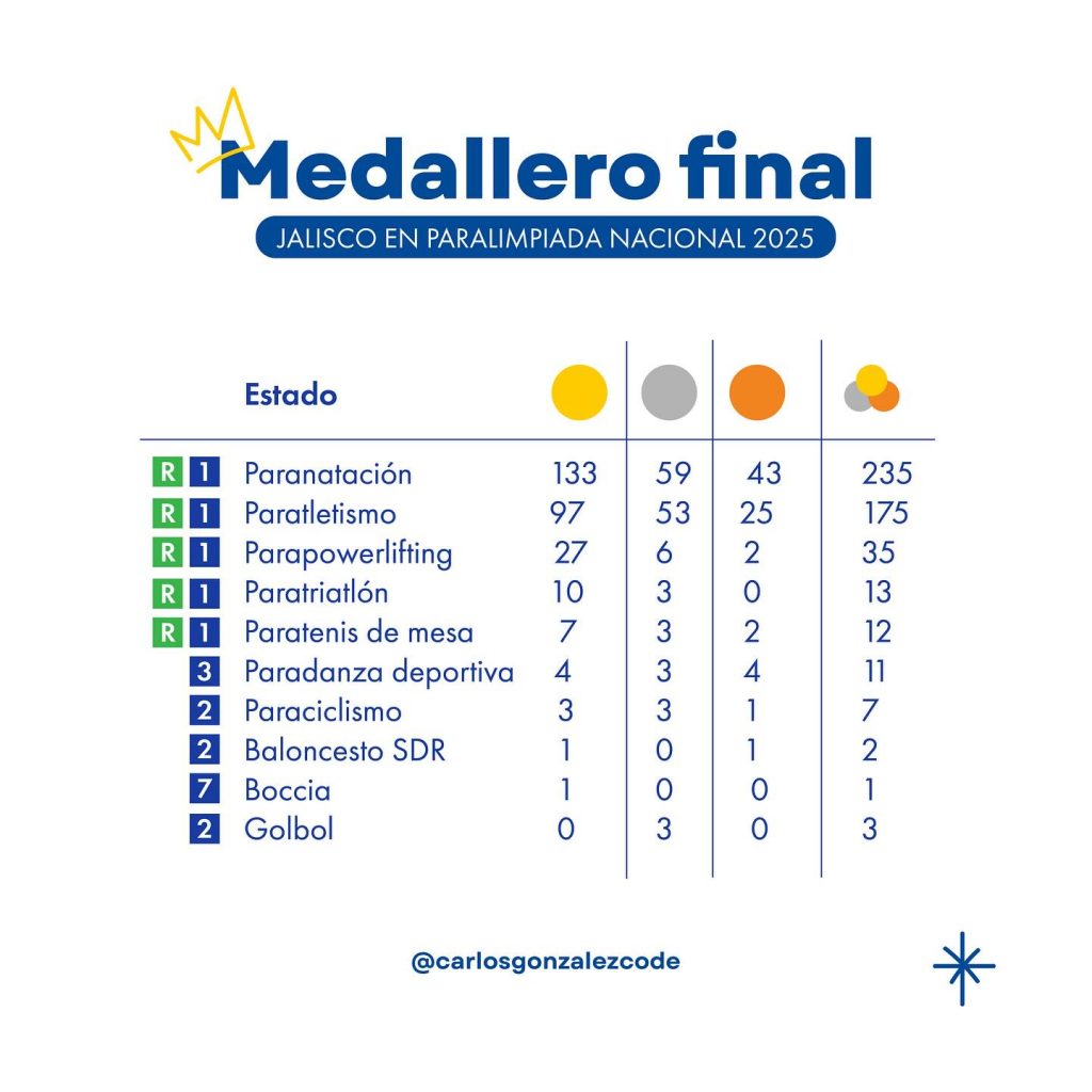 Recordemos que en la competencia de natación, los exponentes vallartenses de deporte adaptado lograron dos medallas de oro, cuatro de plata y tres de bronce, de tal forma que la cosecha total de la delegación vallartense fue de siete preseas de oro, cinco de plata y cuatro de bronce, con lo cual contribuyeron a que la Selección Jalisco consiguiera su título número 20 consecutivo en la Paralimpiada Nacional CONADE 2025, con un total de 283 medallas de oro, incluyendo 92 en paratletismo y además impuso récord nacional con 133 en paranatación.