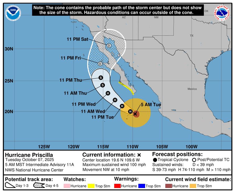 El huracán Priscilla ha alcanzado la Categoría 2 y se encuentra ubicado a 415 kilómetros al oeste suroeste de Cabo Corrientes, Jalisco. Presenta vientos sostenidos de 155 km/h y se desplaza hacia el noroeste a 17 km/h. Aunque su trayectoria indica que se dirige hacia Baja California, se prevé que las costas de Puerto Vallarta experimentarán oleaje elevado de 3 a 4 metros de altura.