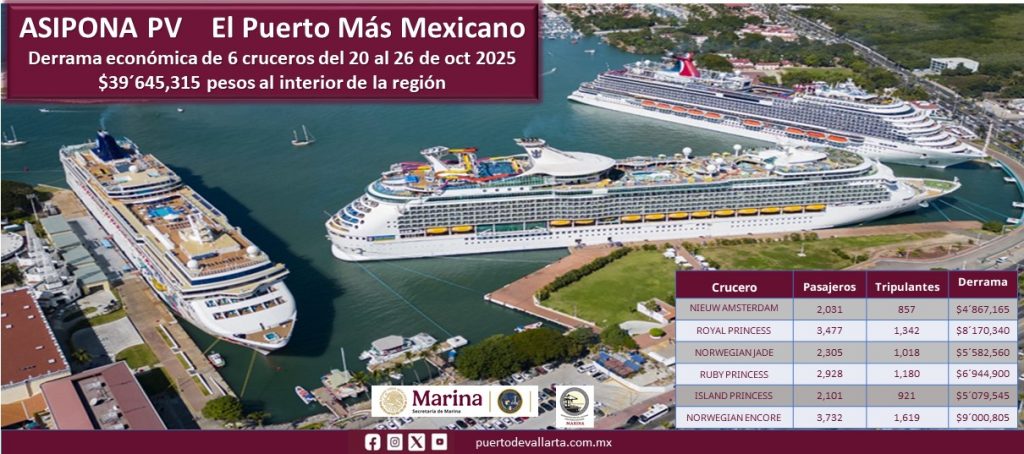 De acuerdo a información de la Administración del Sistema Portuario Nacional (ASIPONA) Puerto Vallarta, en dicho periodo se recibieron seis cruceros y los visitantes generaron una importante derrama económica de $39´645,315 pesos.