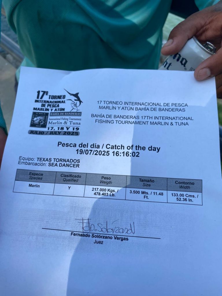 En una muy emotiva segunda y última jornada del certamen deportivo, a bordo de la embarcación “Sea Dancer” logró capturar un ejemplar de 217 kilos, de 3 metros y medio de largo y contorno de un metro 33 centímetros, con lo cual desplazó al ejemplar que la víspera se había colocado en la punta, de 148.6 kilos, capturado por el equipo “El Mexicano Sea Hunter”, que a la postre le significó el segundo lugar.