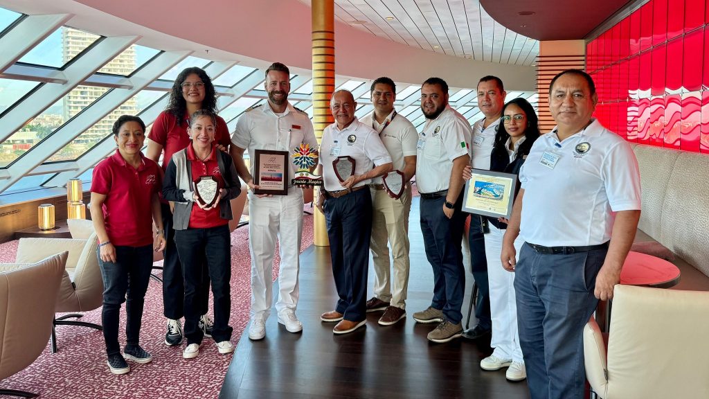 “Puerto Vallarta es la puerta marítima de entrada al estado de Jalisco, cuna del tequila y del mariachi”, comentó el director general de la ASIPONA Puerto Vallarta, Almirante en Retiro Juan Ortiz Guarneros, a la tripulación del crucero durante el tradicional intercambio de placas, este evento protocolario que se realiza cuando un crucero visita por primera vez un puerto.